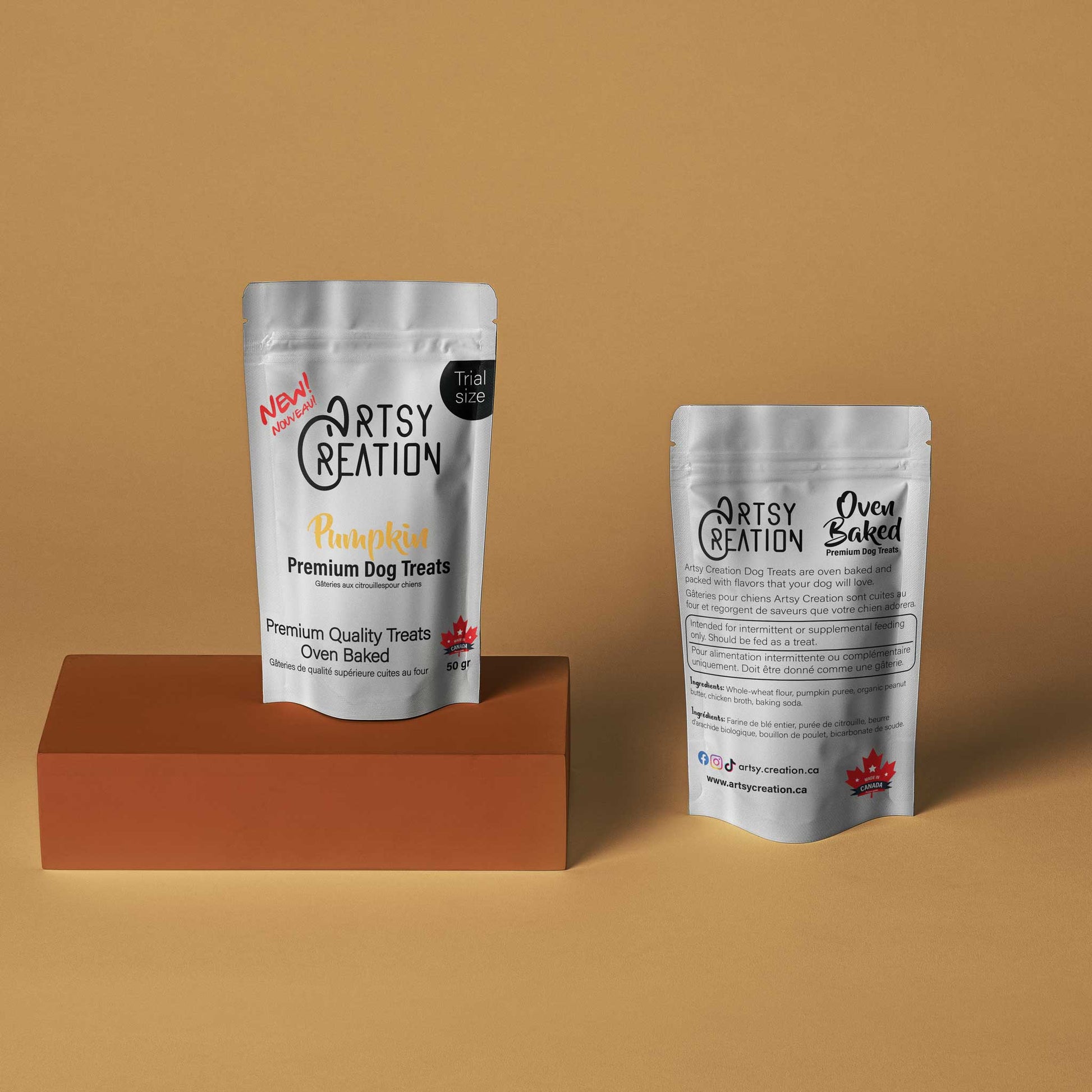 Ingrediénts: Farine de maïs jaune canadien (faite sans ingrédients du blé), purée de citrouille, beurre d'arachide biologique, bouillon de poulet, bicarbonate de soude.