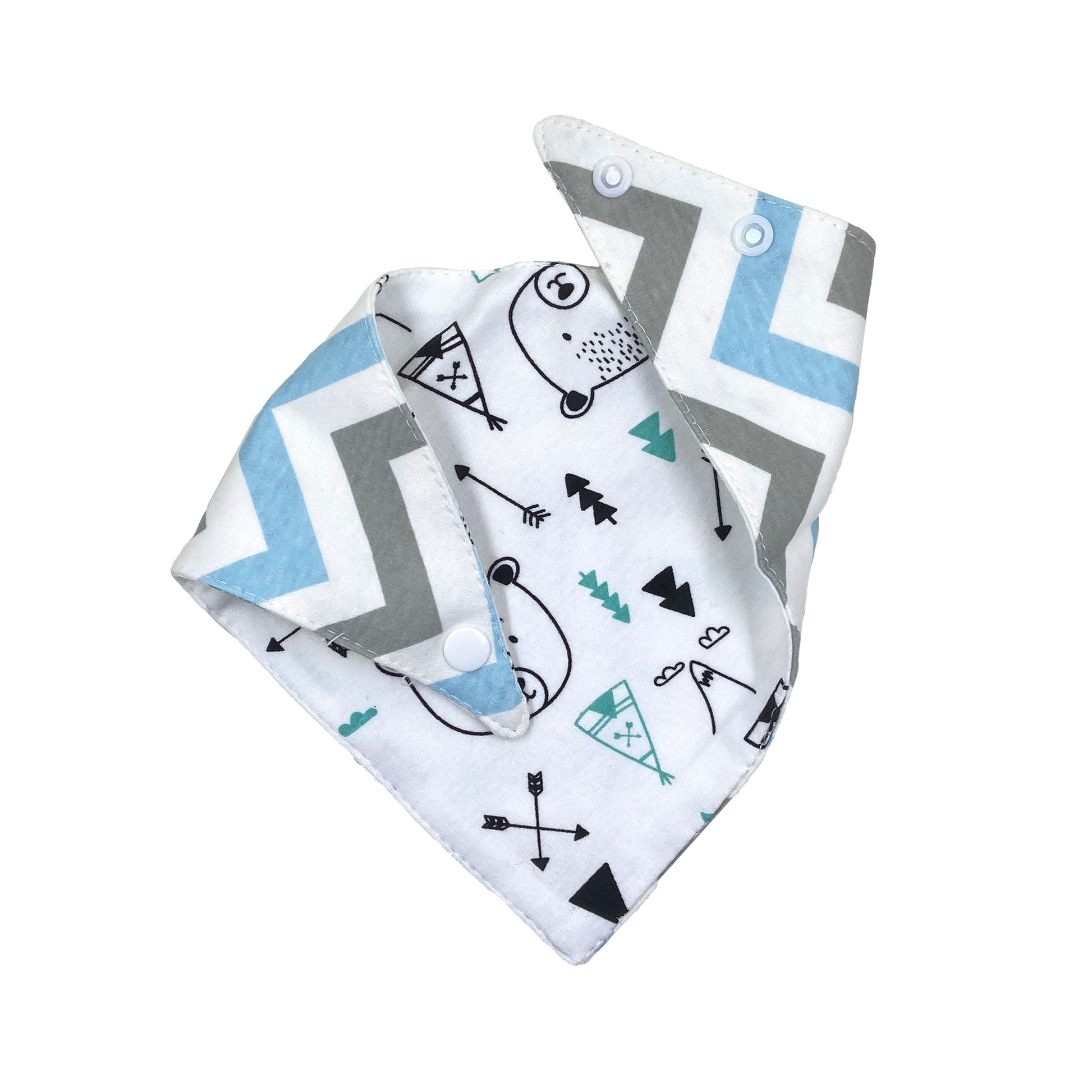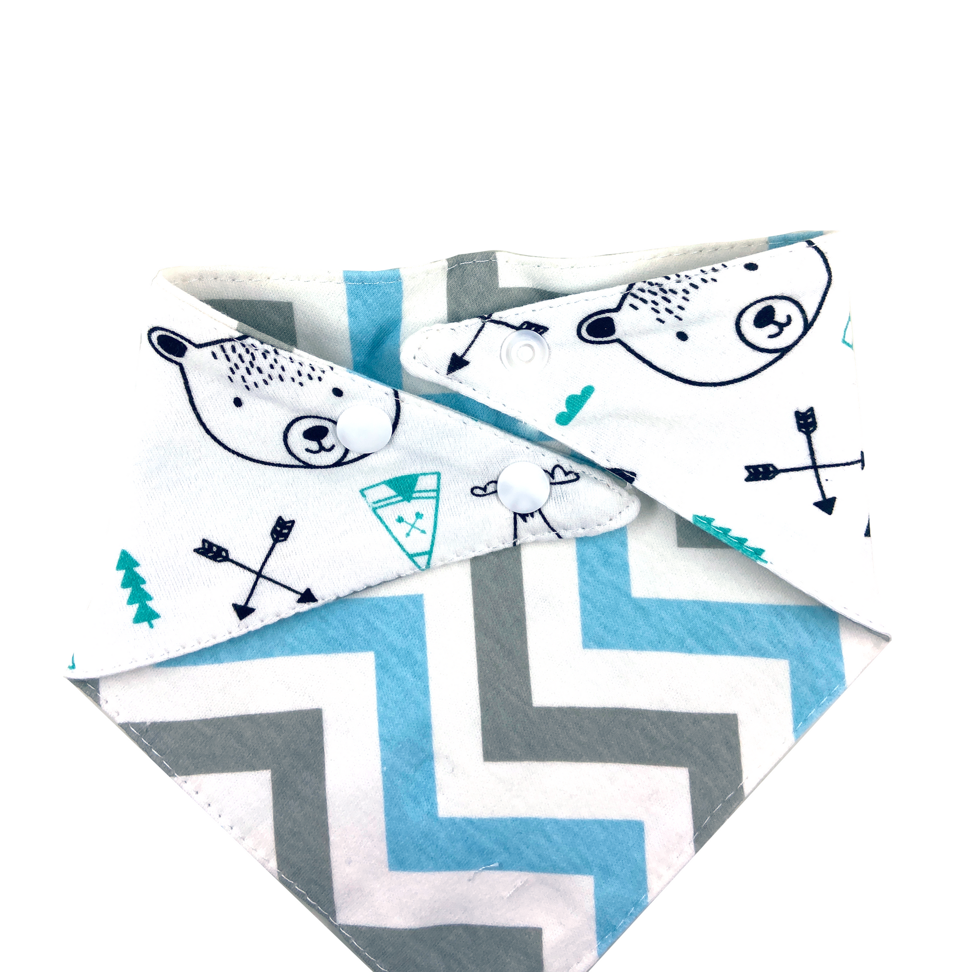 Our bandana is reversible, it snaps on at the neck for a secure and comfortable fit. All bandanas have a set of 2 snaps so you can find your perfect fit. They can be folded to your preferred length, perfect for short-legged fur babies.
