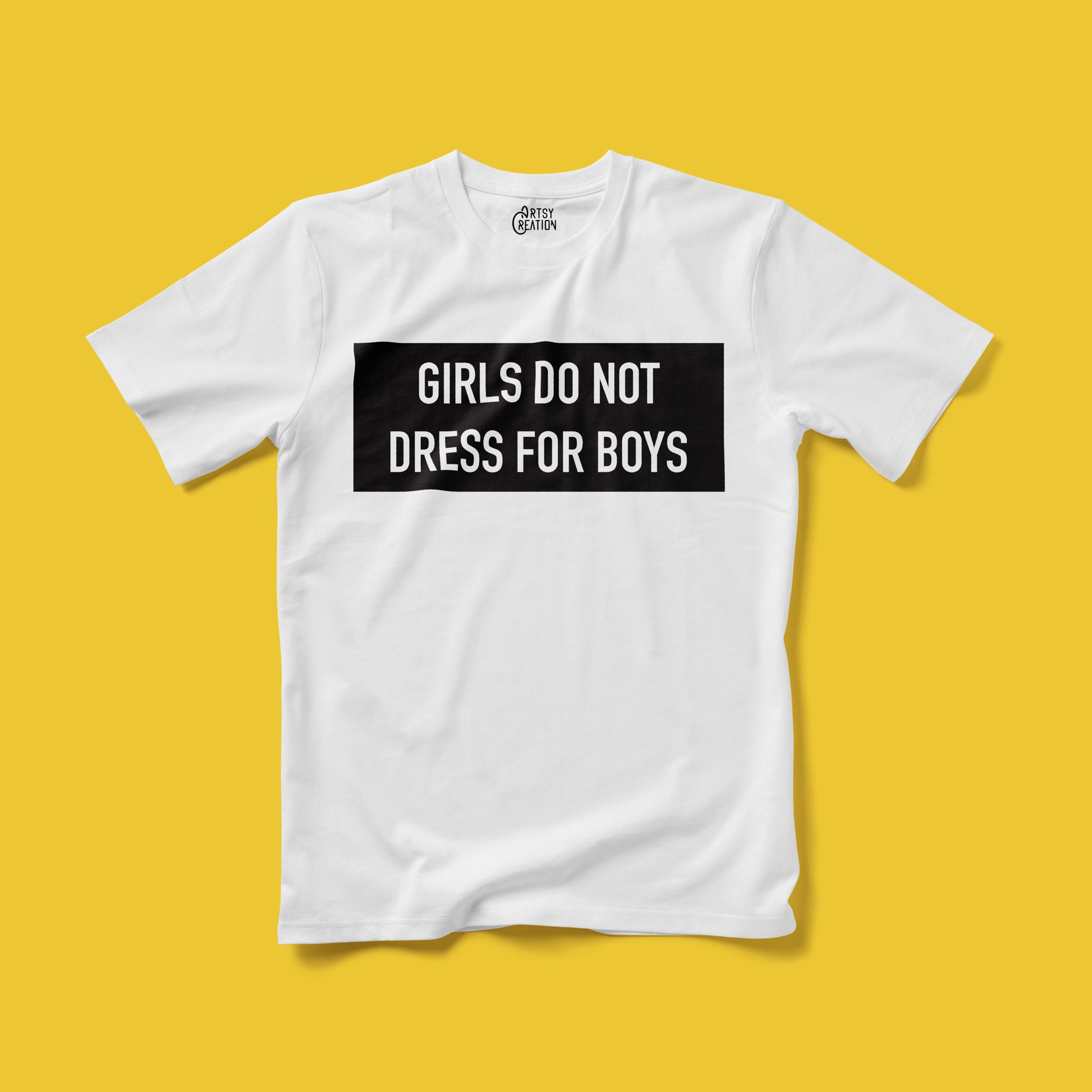 This high-quality t-shirt is made from 100% cotton, making it soft and comfortable for everyday wear. Get your style statement across with this fun, yet stylish 'Girls do not dress for boys' t-shirt - perfect for expressing your individual flair.