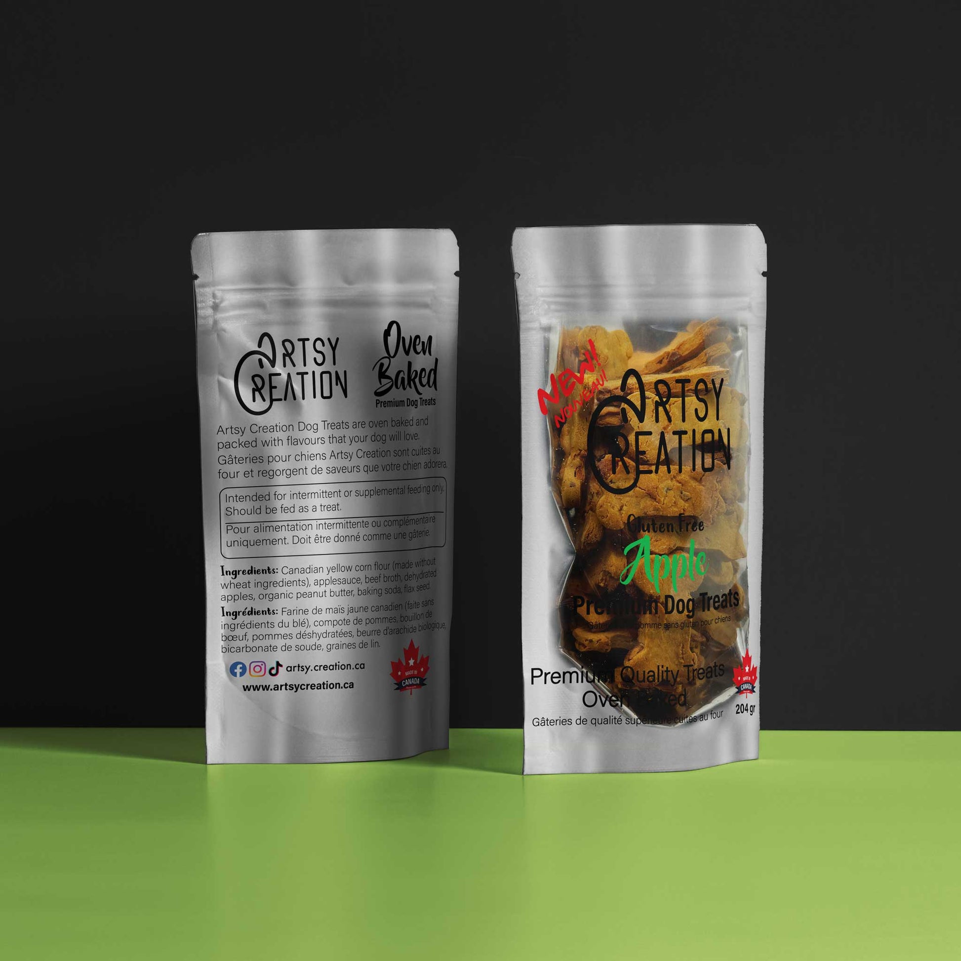 Ingrediénts: Farine de maïs jaune canadien (faite sans ingrédients du blé), compote de pommes, bouillon de bœuf, pommes déshydratées, beurre d'arachide biologique, bicarbonate de soude, graines de lin.