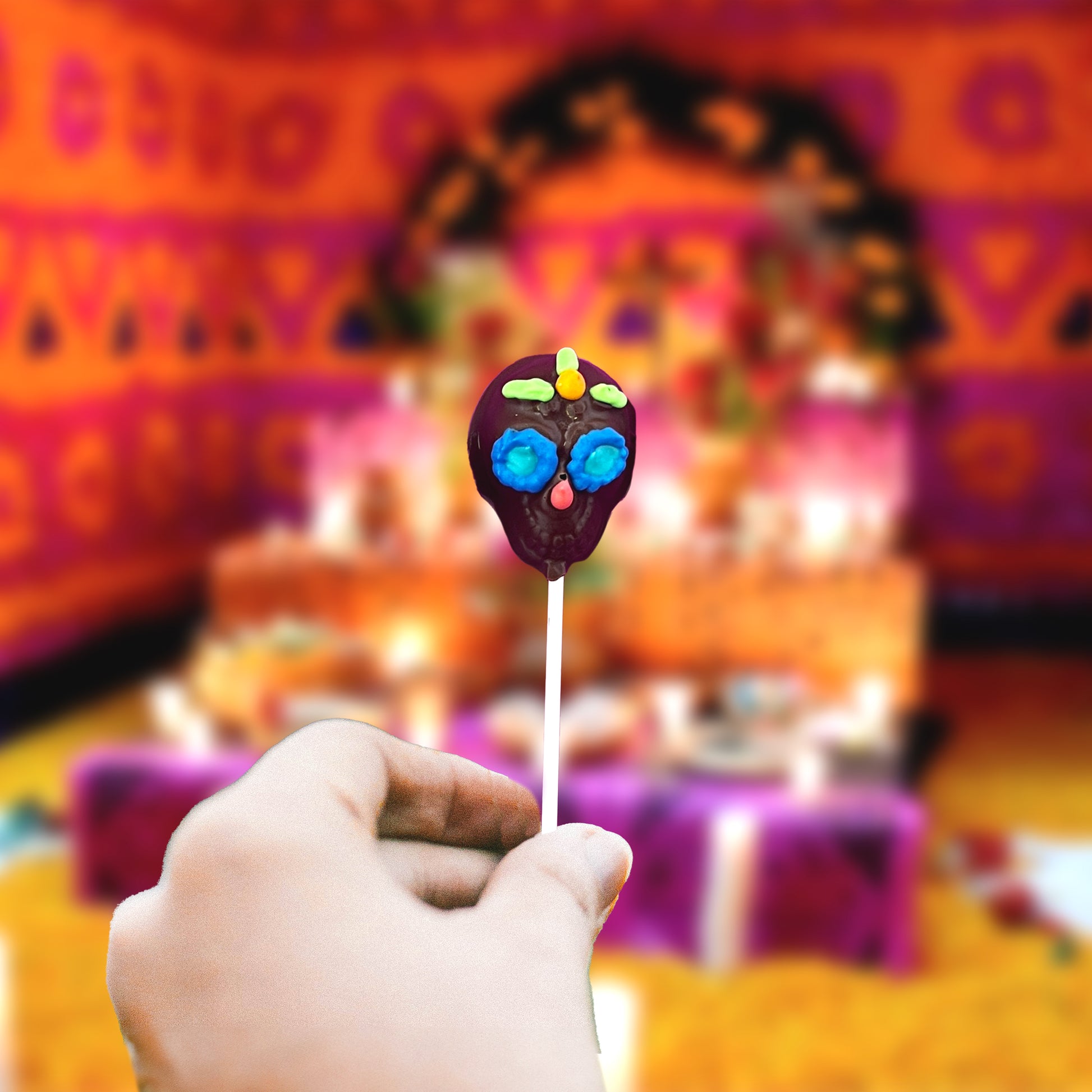 These unique small chocolate lollipops are perfect for Day of the Dead altars. It's made from premium chocolate and pastillage decoration, making it an ideal choice for a special occasion. It's an eye-catching decoration, sure to impress your guests.