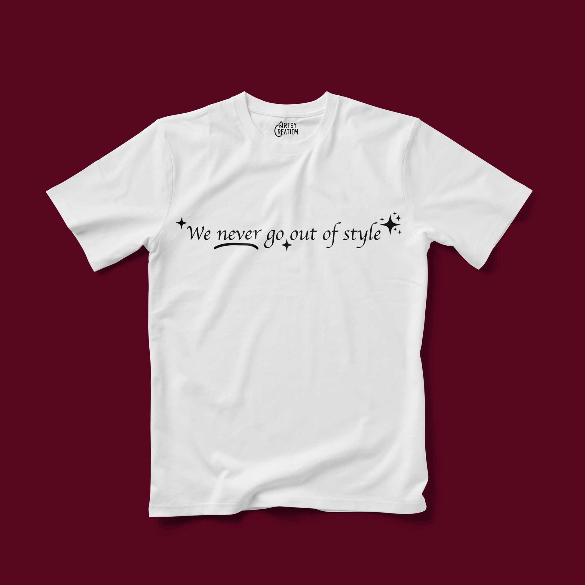 Be the life of the party in this "We never go out of style" t-shirt. Made from 100% cotton, this comfortable tee offers a classic fit and style that won't go out of style. The perfect way to express your individuality.